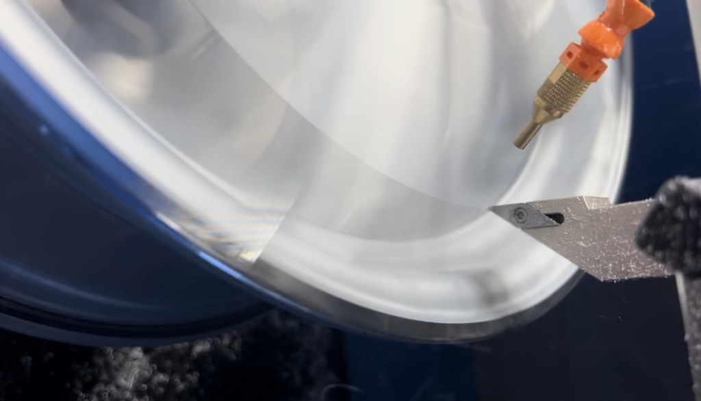 CNC-Bearbeitung der Kontur im beschädigten Randbereich. Dadurch erhält die Felge ihr ursprüngliches Aussehen zurück.
